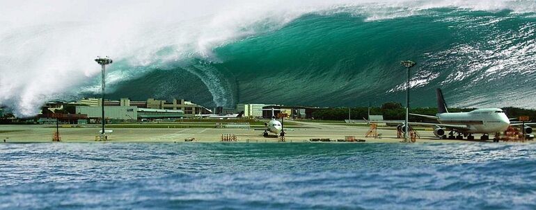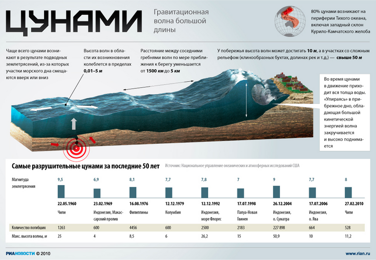 Цунами — гигантские волны, обладающие разрушительной силой и возникающие из-за подводных землетрясений. Ущерб, причиняемый цунами, во много раз превосходит последствия, вызываемые самими землетрясениями.