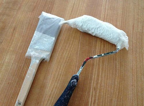 Чтобы валик не высыхал в перерывах между работой, обертывайте его пленкой. Так же можно поступить и с ведром с краской. Крышка откроется легче, если банку сперва обернуть пленкой.