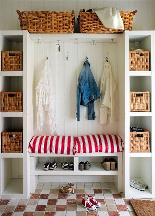 Плетёные корзины способны сделать интерьер более уютным. Они уместны в деревенском и скандинавском стиле. Особенно актуально их применять на даче. В них удобно складывать обувь и немнущиеся вещи. Корзины мобильны и универсальны – их легко переместить и спрятать.