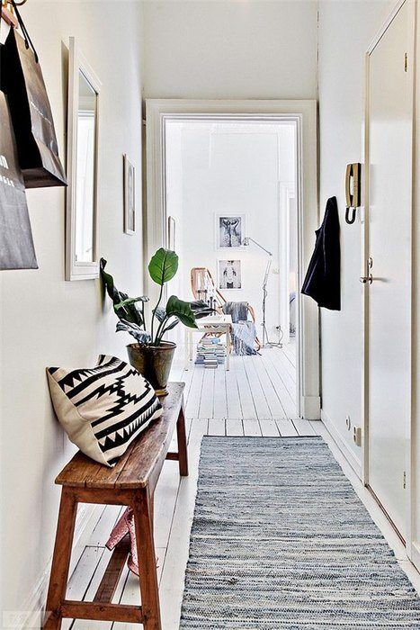 Небольшие полосатые коврики придадут прихожей уюта. Они способны сделать пространство динамичным. Вертикальные полосы помогут удлинить тесную комнату, а горизонтальные – визуально расширят стены.