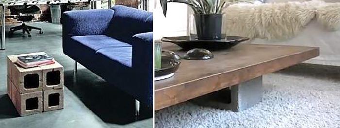 Меня вдохновили и эти простые идеи создания кофейных столиков. Справа — столик из шлакоблоков со столешницей из ореха. А слева — стильный кофейный столик кубовидной формы из восьми шлакоблоков.