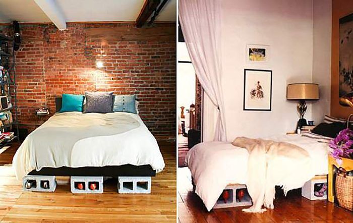 Еще две кровати из шлакоблоков. Слева кровать дизайнеров Рейчел Бин и Бена Брауна. Кровать располагается на шлакоблоках, которые являются еще и местом хранения обуви.В шлакоблоках кровати справа также есть возможность хранить обувь.