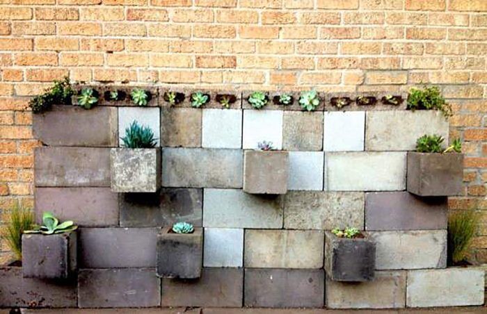 Мне очень нравятся подставки для вазонов из шлакоблоков на фоне кирпичных стен. Здесь собраны все оттенки серого цвета.