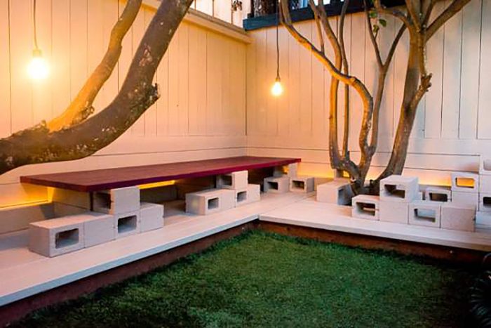 Замечательная идея для бюджетной скамейки. Тебе понадобятся 48 шлакоблоков, сложенные в два ряда, деревянные доски, сиденье из поролона и подушки.