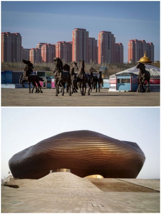 Улицы города украшают арт-объекты и даже футуристический Художественный музей готов, но любоваться этой красотой некому (Kangbashi, Китай).