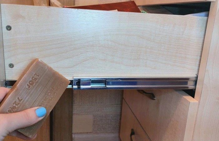 Если ваши ящики начали застревать, значит, пришло время вооружиться хозяйственным мылом. Именно оно поможет быстро избавиться от неприятных моментов. Для этого тщательно смажьте им пазы. Результат появится незамедлительно.