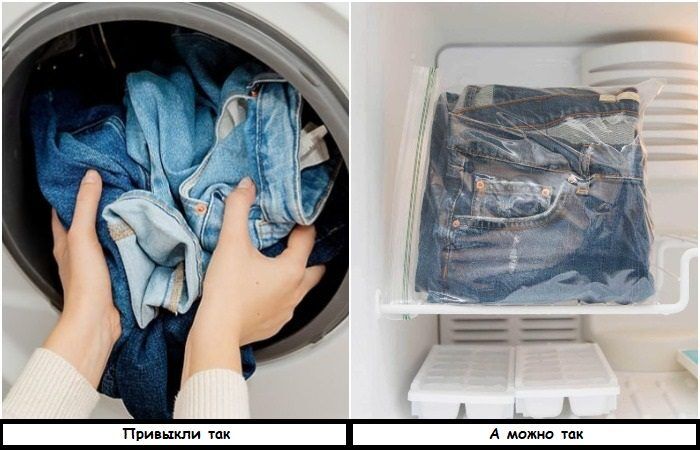 Если вы неделю ходили на работу в одним и тех же джинсах, но никаких загрязнений на ткани нет, совсем необязательно отправлять их в стиральную машину. Все мы знаем, что от частых стирок джинсы выцветают, деформируются и становятся непригодными для носки. Именно поэтому опытные хозяйки рекомендуют периодически заменять стирку на заморозку. Низкие температуры помогают избавиться от бактерий и вернуть джинсам свежесть.