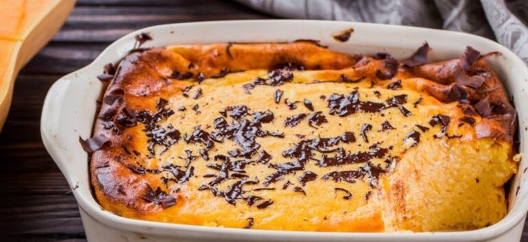 Тыкву натереть на мелкой терке, смешать с творогом, яйцами, манкой, медом и корицей, выложить в форму и запекать при 180 градусах около 40 минут до плотной, но нежной текстуры.