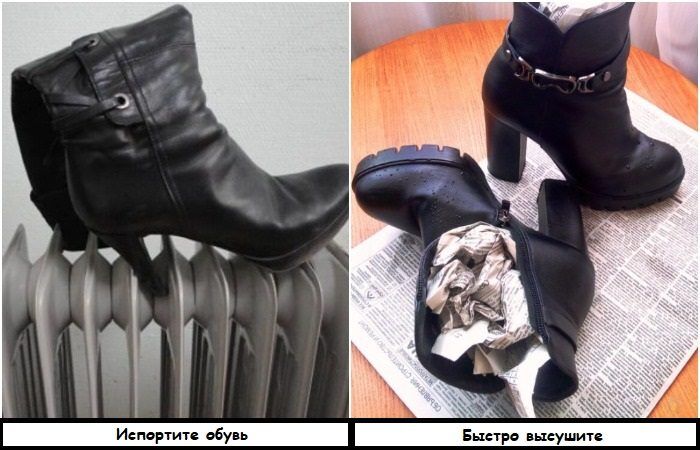 Если обувь все-таки промокла, действовать нужно оперативно. Для начала следует запомнить, что ее ни в коем случае нельзя сушить на батарее или горячим воздухом из фена. Высокие температуры могут привести к деформации обуви – например, начнет отставать подошва.