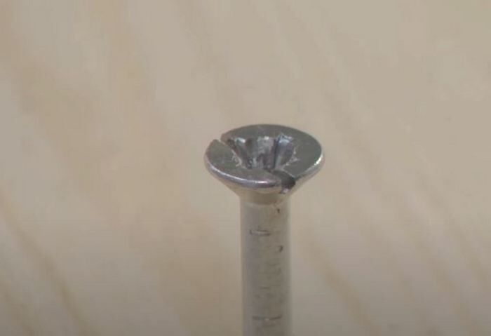 Если шляпку болта или шурупа сточить нельзя, то можно попытаться проделать канал под плоский шлиц отвертки или соответствующую биту шуруповерта в самой шляпке. Сделать это можно несколькими способами: при помощи болгарки, при помощи ударов через открытку, при помощи небольшого долота. Правда, данный метод скорее всего не сработает при серьезном разрушении граней.