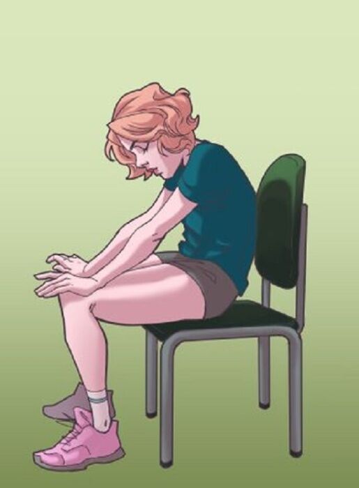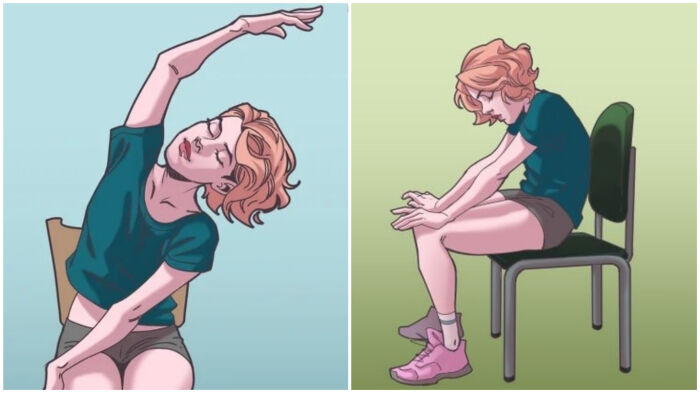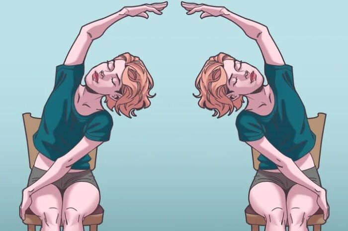 Сидя на стуле, нужно максимально повернуться назад в одну из сторон. При этом бедра должны остаться на месте, ни одно из колен не должно выйти вперед. Делая скрутку вправо, следует положить левую руку на внешнюю часть правого колена и отталкиваться ею для более глубокой растяжки. Таким образом левая рука помогает сделать скрутку более интенсивной. Правая рука при этом должна находиться строго возле копчика на стуле. Это опора и гарант того, что позвоночник будет находиться строго вертикально, без нежелательных прогибов. Это упражнение также способно улучшить настроение: дело в том, что зажатости вдоль позвоночника нередко приводят человека в подавленное состояние. Крайне эффективное и простое, это упражнение расслабит мышцы и придаст сил для дальнейшей работы.