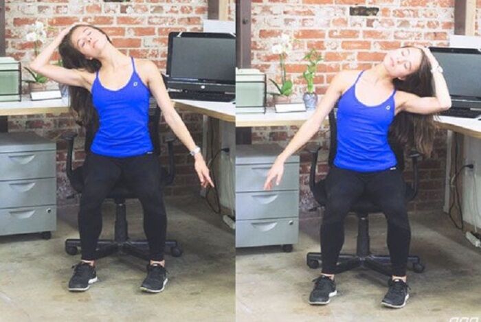 Сидя на стуле, потянитесь позвоночником вверх. Позвольте голове неспешно опуститься вперёд. Сделайте несколько вдохов и выдохов. Опустите одну руку вниз и отодвиньте ее на 45 градусов от тела, выпрямите руку. Плавно перенесите голову в противоположную от руки сторону, пытаясь дотянуться ухом до плеча. Вы ощутите растяжение мышц. Двигая головой или рукой вы можете регулировать их натяжение. На вдохе перенесите голову обратно в переднее положение. Проделайте то же самое с другой стороной.