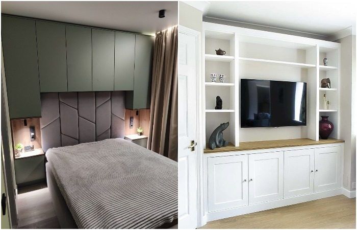 Спальни в хрущевках обычно небольшие, поэтому так важно установить правильный шкаф, который не займет половину комнаты. Чаще всего выбирают встроенные модели, но можно пойти еще дальше и сделать в изголовье кровати целый «городок» из шкафов. Получится своеобразный аналог мебельной стенки, в которой можно будет хранить что-угодно, начиная от одежды, и заканчивая постельными принадлежностями. Главное, чтобы дверцы шкафов открывались от кровати, чтобы вы могли положить в них, например, телефон или книгу, не вставая.