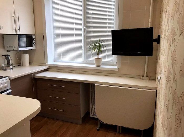 Маленькая кухня – главная боль владельцев хрущевок. Здесь даже готовить затруднительно, не говоря уже о том, чтобы собраться всей семьей за ужиной или посидеть вместе с друзьями. Поэтому важно определиться, как именно вы будете экономить место в комнате. Как вариант – отказаться от классической обеденной зоны в пользу более компактных решений.