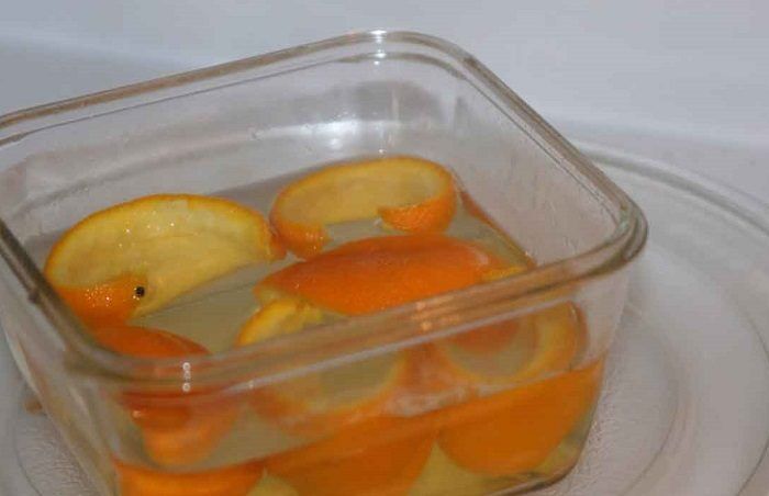 Поставьте в микроволновку миску с апельсиновыми корками.