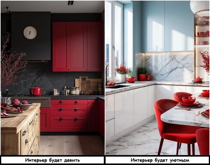 Вместо того, чтобы использовать красную мебель или краску для стен, выбирайте небольшие акценты, например, шторы, рамки для постеров, посуду, которая стоит на виду. Так вы не перегрузите интерьер и не лишите его уютной составляющей.