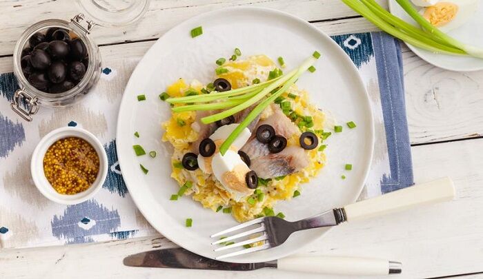 Среди ингредиентов для салата: 600 граммов картофеля, одна столовая ложка нарезанных черных маслин, два вареных яйца, две чайные ложки дижонской горчицы, 250 граммов сельди, зеленый лук по вкусу, два огурца, восемь столовых ложек натурального йогурта, соль и перец.