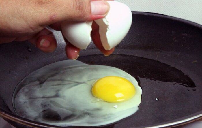 Правильная яичница – это глазунья. Все остальное – омлет или недоделанный омлет. Поэтому яйца нужно правильно разбивать и выворачивать на горячую сковороду. Сделать нужно все так, чтобы желток не лопнул. Для этого нужно разбивать и разламывать скорлупу как можно ближе к горячей поверхности.