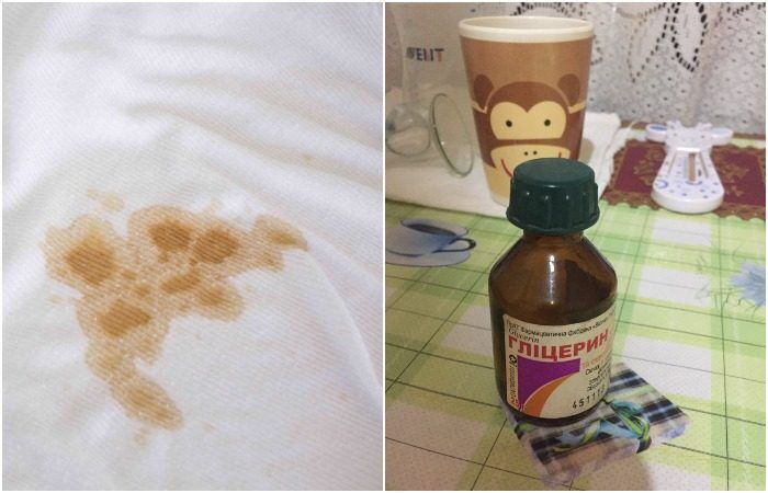 Еще одно средство, которое отлично растворяет танины (вещества, которые содержатся в кофе и окрашиваю ткань) – это глицерин. Его нужно нанести на пятно, оставить на 20 минут, смыть и постирать одежду в стиральной машине. Если пятно успело засохнуть, смешайте небольшое количество соли и глицерина (берите в равных количествах) и готовую кашицу нанесите на загрязненный участок ткани. Оставьте на 15 минут, затем уберите остатки средства старой зубной щеткой, прополощите одежду в чистой воде и отправьте в стиральную машину.
