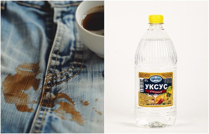 Если вы пролили кофе на джинсы, самым лучшим помощником в выведении пятен станет 9-процентный уксус. Обратите внимание, что эссенцию брать нельзя, так как в ней содержится высокая концентрация уксусной кислоты, которая может повредить ткань. Как и любое другое средство, уксус лучше всего справляется со свежими пятнами, но при необходимости может вывести и засохшие. Смочите ватный диск уксусом, приложите к пятну и оставьте на 15 минут. После этого прополощите и постирайте вещь.