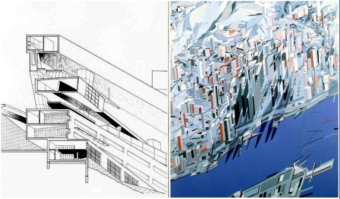 Нереальные формы и наполнение горизонтального небоскреба от Захи Хадид (концепт The Peak Leisure Club, 1982-1983 гг.).