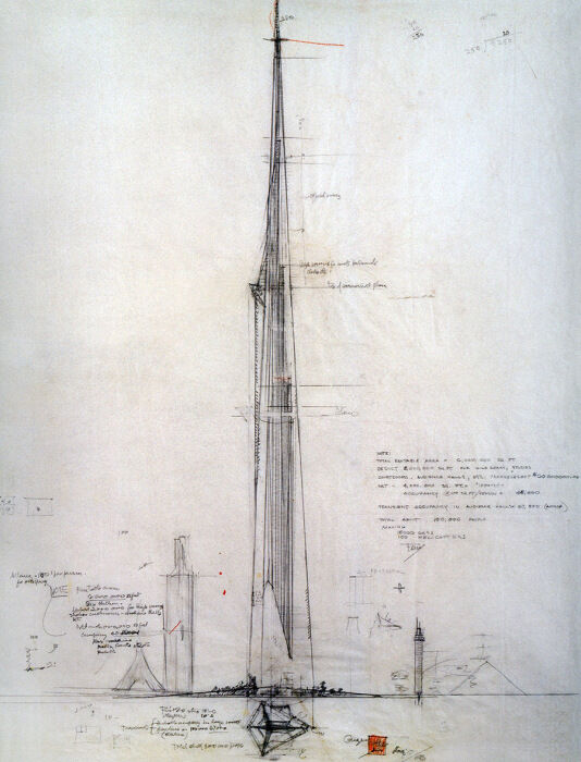 Небоскреб The Illinois Sky City («Небесный город Иллинойс»), который разрабатывался для Чикаго гениальным Фрэнком Ллойдой Райтом еще в середине прошлого века (1957 г.) должен был стать самым грандиозным сооружением мира. И это неспроста, ведь его высота, согласно чертежам, достигает 1703 м (вместе со шпилем), что в два раза превышает Бурдж-Халиф в Дубае. Этот проект так и не был внедрен в жизнь по понятным причинам, ведь до сих пор не придуманы конструкции и материалы, которые смогли бы удержать объект такой высоты.