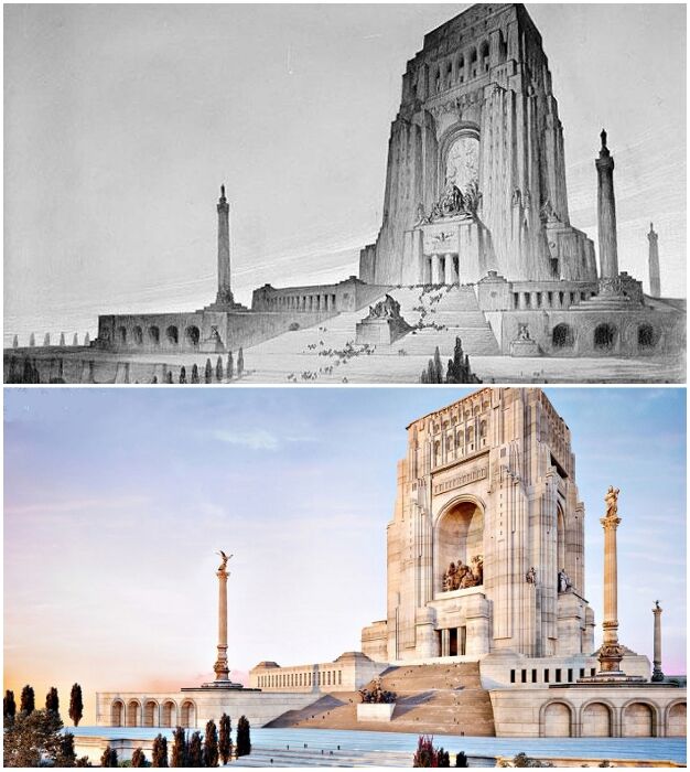 Хотя мемориал обещал быть грандиозным и действительно величественно прекрасным учитывая, что высота арок, находящихся внутри монумента, составляла 90 м. и это, не говоря о скульптурах, колоннах, портиках, изобилии изысканного декора и белого мрамора.