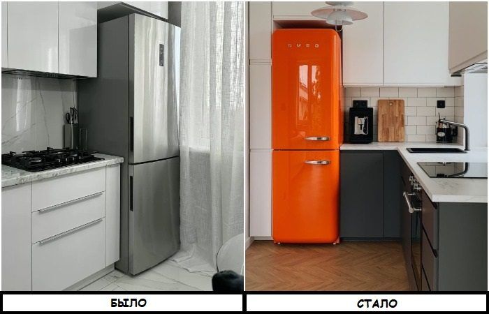 Это отличное решение, если вам не хочется менять или реставрировать гарнитур, но нужно как-то добавить красок в интерьер. Замените обычный холодильник, который можно встретить на тысячах других кухонь, на ретро-модель. Она задаст тон всему интерьеру и сразу привлечет внимание. Дизайнеры отмечают, что всего один предмет интерьера с характером может смело заменить обновление фасадов. Важно лишь следить, чтобы его цвет перекликался с другими деталями, например, шторами, мебельной обивкой, посудой на открытых полках и пр.