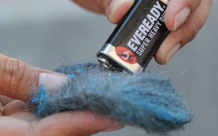 Шерстяные вещи – лучшие вещи для похода на природу. В том числе потому, что если под рукой окажется батарейка и не окажется спичек, то добыть огонь можно именно из шерсти. Придется долго тереть контактом батарейки по шерсти, однако спустя некоторое время материал начнет тлеть, а затем и вовсе гореть. Лучше всего подходит для этого батарейка 9 Вт.