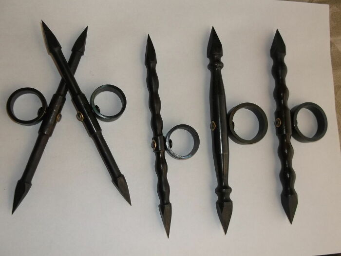 Другой весьма необычный кастет японского происхождения. Когда именно были придуманы сантенсу сказать сложно. Скорее всего первые образцы появились еще в эпоху воюющих провинций XV-XVI веков. Первоначально сантесу использовались наемными убийцами. Металлическая палочка кастета вкладывается в ладонь, а в кольцо вставляется один из пальцев. При кажущейся простоте японской кастет крайне грозное оружие, так как позволяет наносить болезненные удары любой стороной и любым положением ладони.