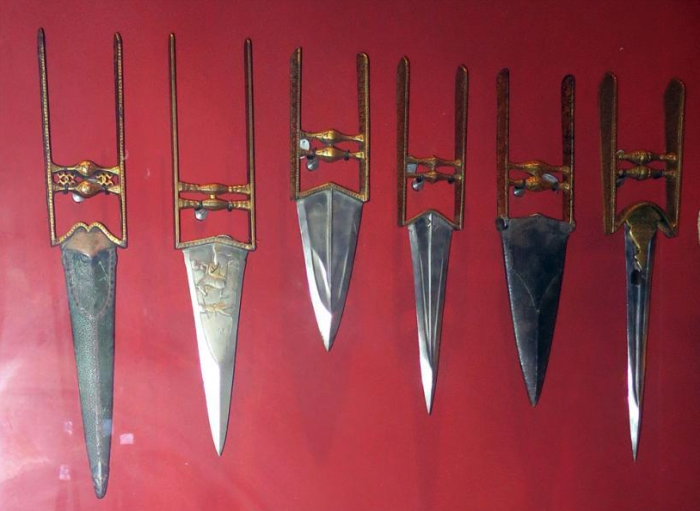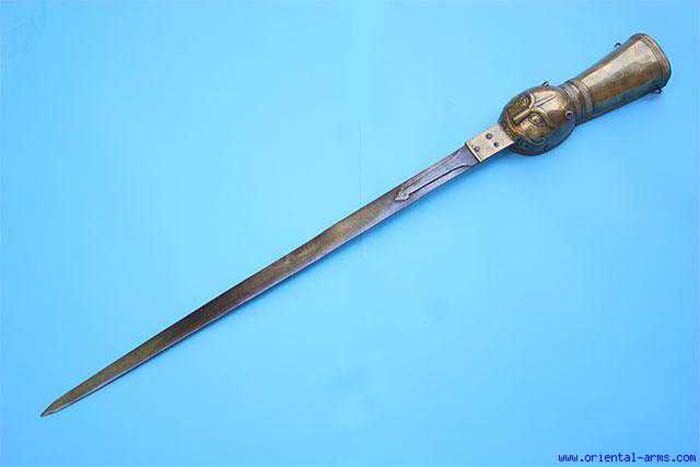 Не ближневосточная страна, а индийский кинжал тычкового типа. Первые упоминания катаров восходят к XIII веку. Кем и зачем использовалось такое специфическое оружие – сказать сложно. Скорее всего катар применялся в качестве «гражданского» или ритуального оружия. Впрочем, боевые качества данного кинжала весьма высоки. Кажущаяся на первый взгляд неудобная рукоятка в действительности самая сильная сторона этого кинжала. Во-первых, она прикрывает руку. Во-вторых, выронить индийский клинок практически невозможно.
