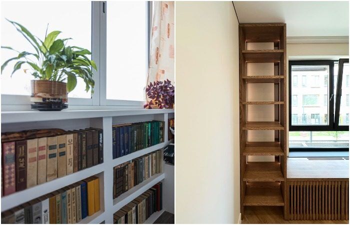 Еще один вариант того, как по максимуму задействовать пространство в маленькой квартире, – сделать по бокам от оконного проема стеллажи, а подоконник превратить в полку. Это отличное решение, если в доме есть много книг, декора и полезных мелочей, которые негде разместить. Чтобы избежать визуального шума, предусмотрите для вещей красивые корзинки, коробки, органайзеры и пр.