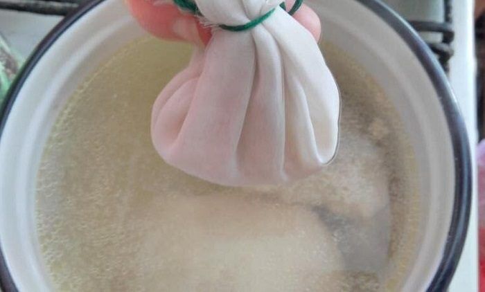 Опустите в бульон мешочек с рисом.