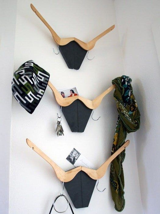 А так можно оформить стену в прихожей. Переверните плечики, срежьте одну из сторон, склейте между собой с помощью прочного клея и прикрутите к деревянному бруску саморезами.