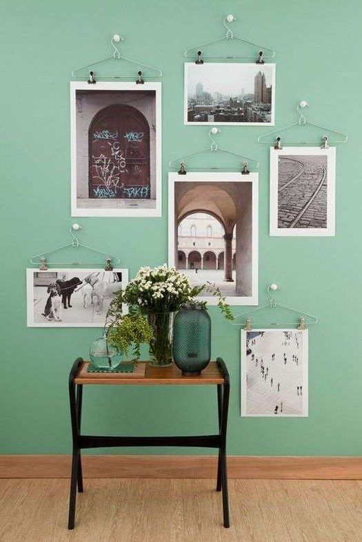 Вешалки можно использовать и вместо рам для картин. Закрепите изображения с помощью зажимов-крокодильчиков к нижней планке вешалки и развесьте постеры или рисунки на стене. Смотрится очень стильно.