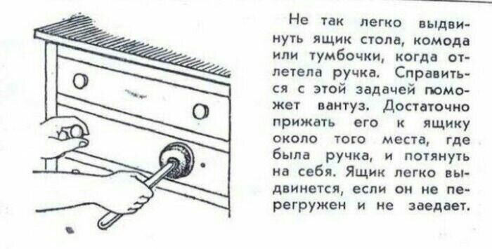 Если отвалилась ручка, вантуз придёт на помощь. /Фото: maximonline.com Пожалуй, это один из самых забавных и в то же время потенциально работающих советов. Действительно, открыть тумбочку, если ручка отвалилась, можно с помощью вантуза - тогда не придется ломать ногти и даже пальцы в попытке подцепить упрямую дверцу сбоку. Хотя одна проблема возникнуть может: не факт, что сантехническая присоска сможет достаточно хорошо прикрепиться к лакированной поверхности тумбочки или комода.