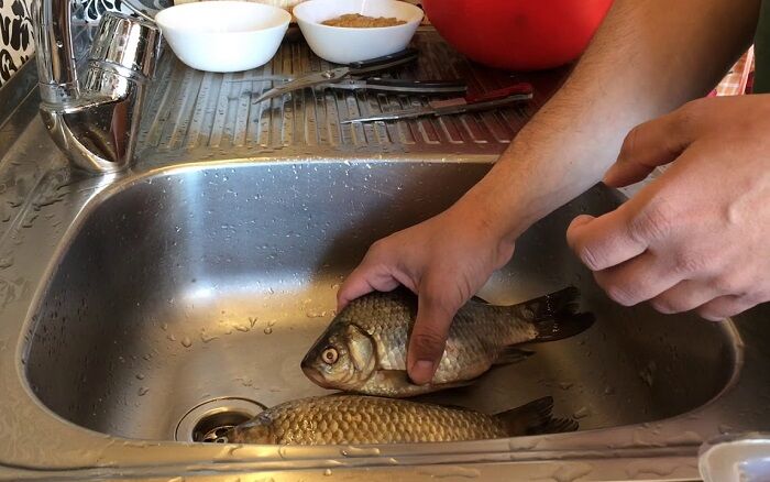 Первое и самое главное – никогда не заливайте продукт горячей водой, а также не кладите его на батарею или в микроволновую печь – получится сухое блюдо. Лучше всего вечером, накануне готовки, переложить рыбу из морозилки в холодильник и оставить на ночь. Если она полностью не оттаяла, залейте ее холодной водой и оставьте на столе при комнатной температуре. Меняйте жидкость через каждый час, пока рыба не будет готова к маринованию. Далее слейте жидкость, хорошо промойте продукт и вытрите его насухо. Планируете жарить? Тогда оставьте на разделочной доске, чтобы кусочки подсохли.