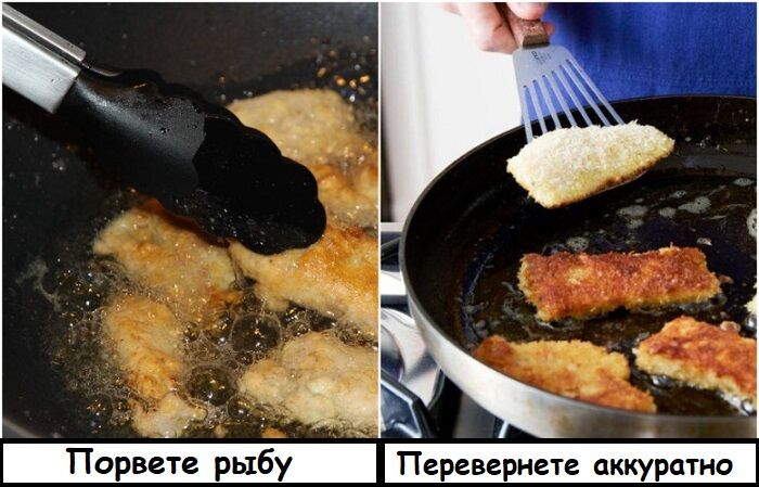 Переворачивать кусочки рыбы лучше лопаткой, чем щипцами