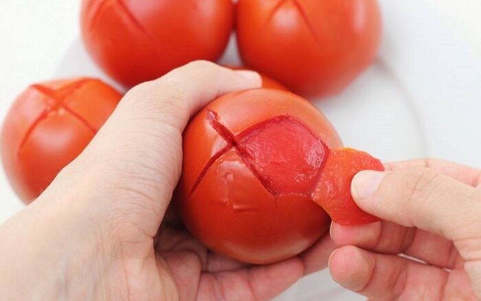 Помидоры нужны для приготовления большого количества блюд, но далеко не всегда их нужно использовать вместе с кожурой. Если в рецепте сказано, что томаты нужно предварительно очистить от кожицы, на помощь придет следующий лайфхак. Возьмите нож и сделайте на каждом помидоре крестообразный надрез. После этого положите их в миску, залейте кипятком и оставьте примерно на пять минут. Затем слейте жидкость и снимите шкурку – она поддастся без труда, и вы справитесь с задачей за пару минут.