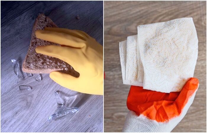 Также можно использовать бумажное полотенце. Оторвите от рулона несколько кусочков, положите друг на друга и сверните в квадрат, чтобы полотенце стало прочнее. Затем слегка смочите его водой из-под крана (важно, чтобы салфетка стала влажной, а не мокрой), и пройдитесь по тем участкам пола, где могут быть осколки. Заверните полотенце таким образом, чтобы стекло оказалось внутри, и выбросьте в мусорное ведро.