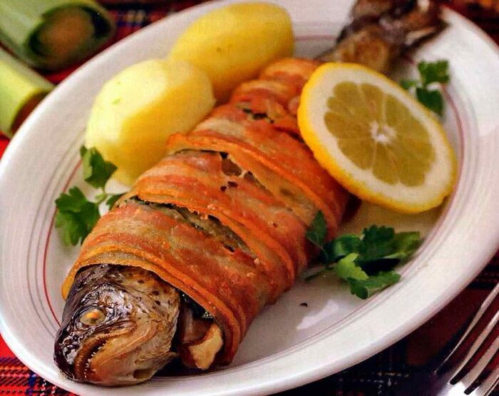 Бекон дарит рыбе копченый аромат. / Фото: kakprosto.ru