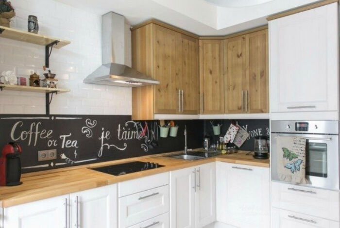 Грифельная доска или наклейка в зоне фартука - стильное и современное решение, которое позволит ежедневно менять интерьер своей кухни, украшая пространство рисунками или ободряющими надписями.