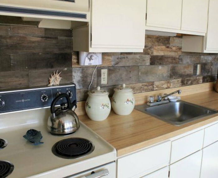 Кухонный фартук, украшенный необработанными досками из светлого дерева, станет чудесным дополнением уютной деревенской кухни.