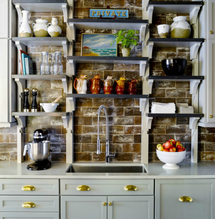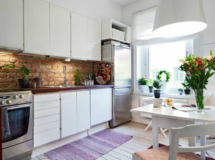 Кирпичная кладка или ее имитация в зоне кухонного фартука выглядит весьма нетривиально и свежо. Такое решение гармонично впишется в кухню, оформленную в индустриальном, рустикальном или кантри стиле.