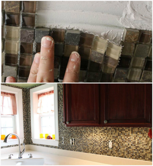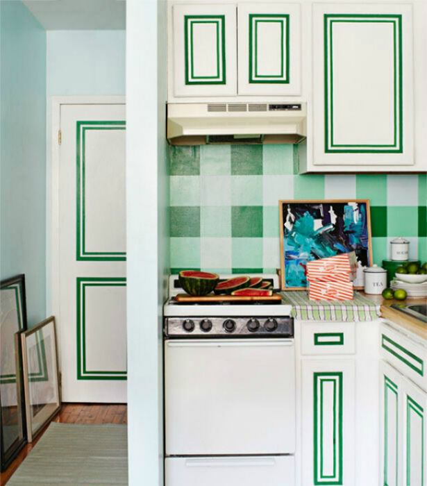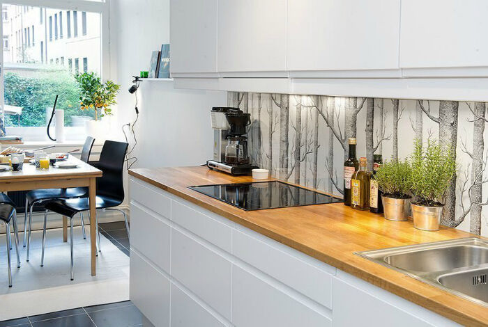 Клеенка, аккуратно наклеенная в зоне кухонного фартука, - копеечный способ, способный преобразить интерьер пищеблока.