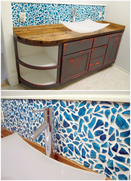 Использование обломков старой керамической посуды в комплексе с декоративной штукатуркой - оригинальный способ создания собственного эксклюзивного дизайна кухонного фартука.