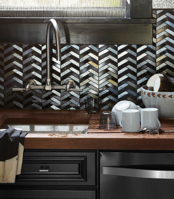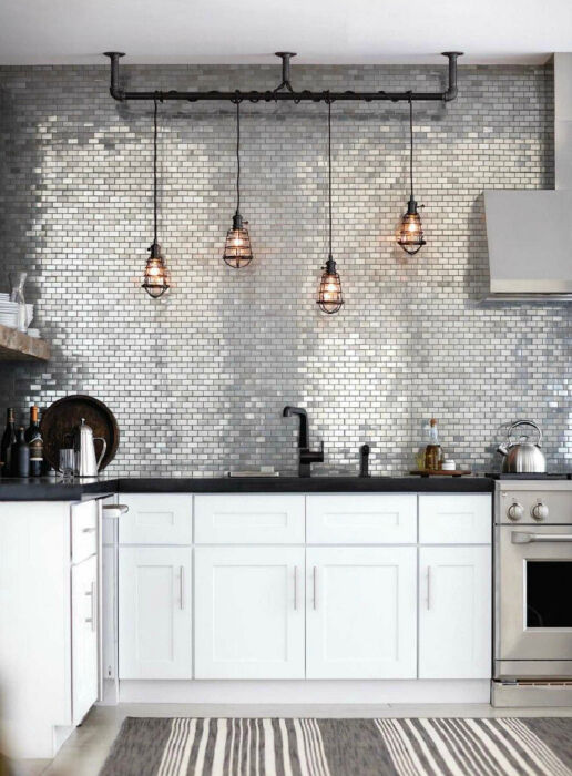 Кухонный фартук, облицованный узкими блестящими плиточками, подчеркнет и дополнит интерьер любого современного пищеблока.