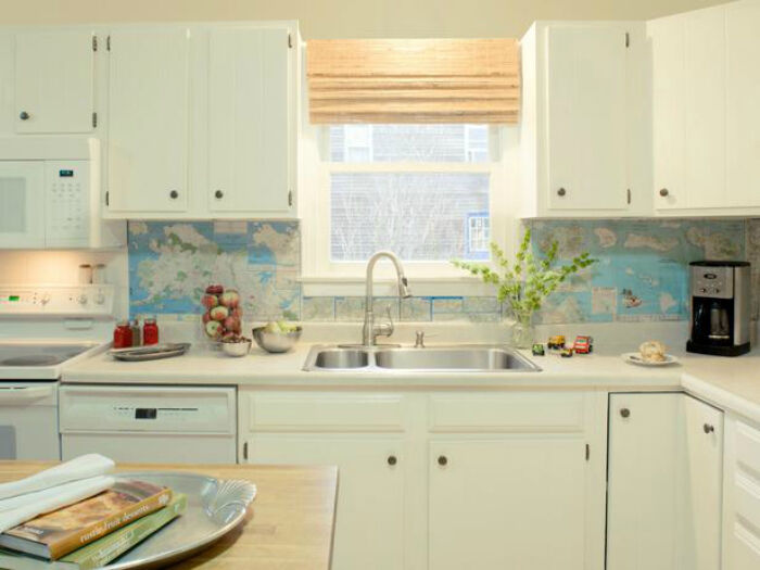 Оригинально оформить кухонный фартук поможет карта мира. Единственный момент, о котором необходимо позаботиться - это хорошее водоотталкивающее покрытие.