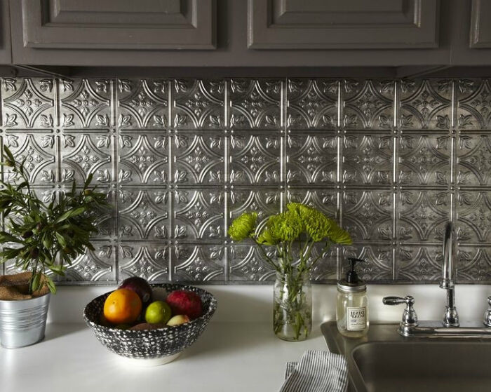 Пенопластовые панели, покрашенные в стильный металлический оттенок, - оригинальное и бюджетное решение для отделки кухонного фартука.