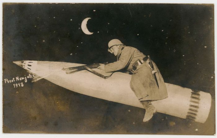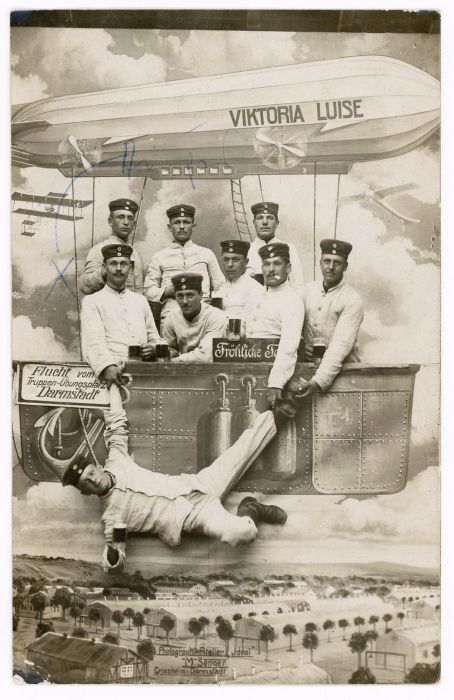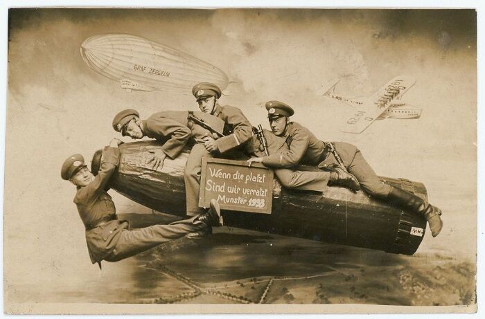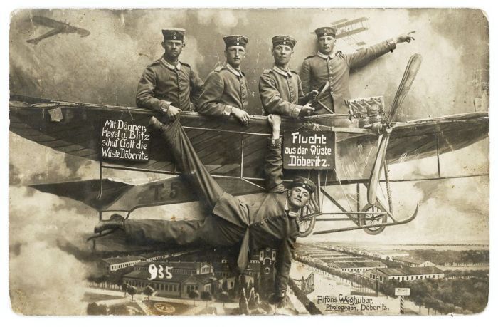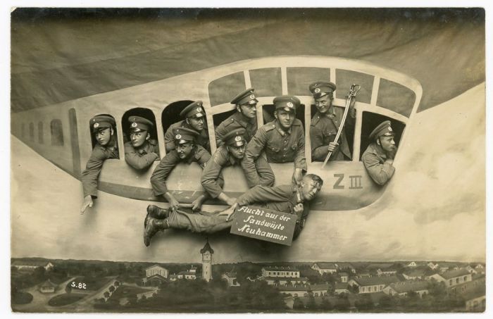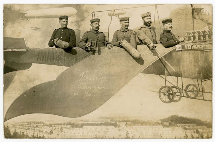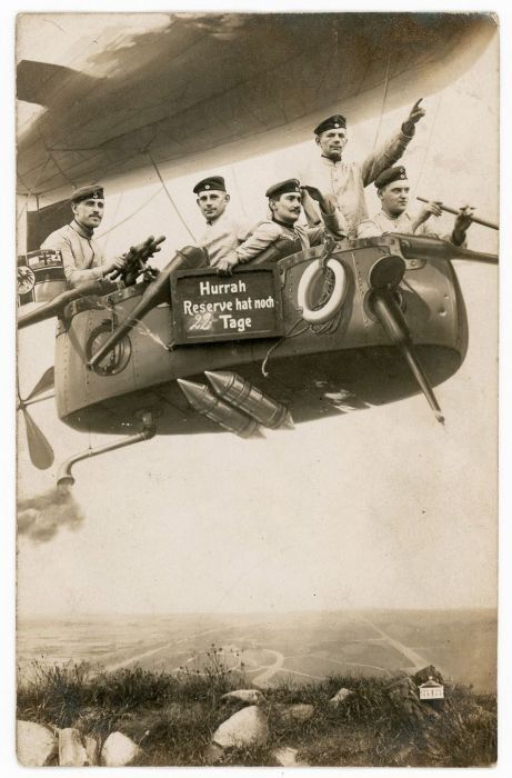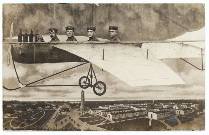 Уже в конце XIX века в фотостудиях использовали в качестве реквизита фанерные или нарисованные самолёты, воздушные шары, поезда и автомобили. С началом Первой мировой подобная атрибутика стало пользоваться огромной популярностью. Военнослужащие обязательно старались сделать такое фото, чтобы отправить его домой. В этом обзоре фотографии, которые были сделаны с начала Первой мировой и до конца Второй мировой.